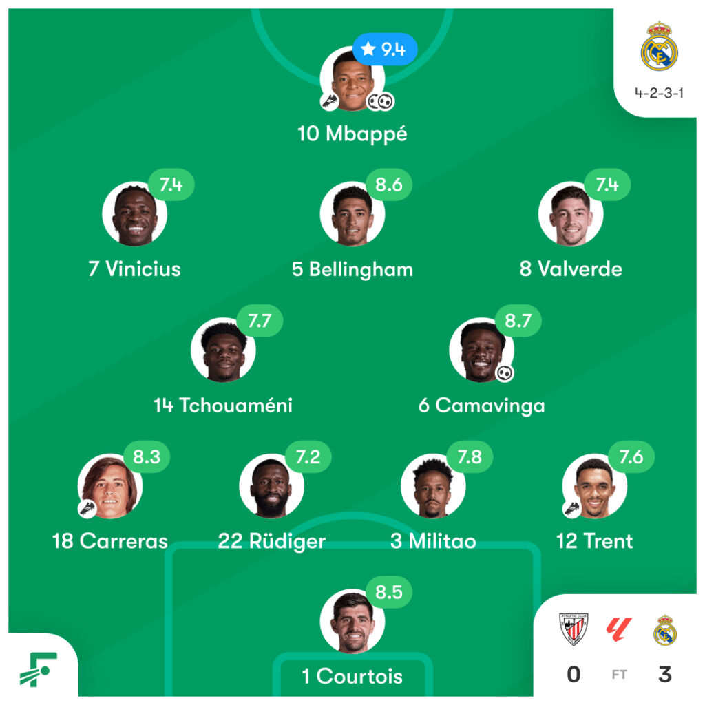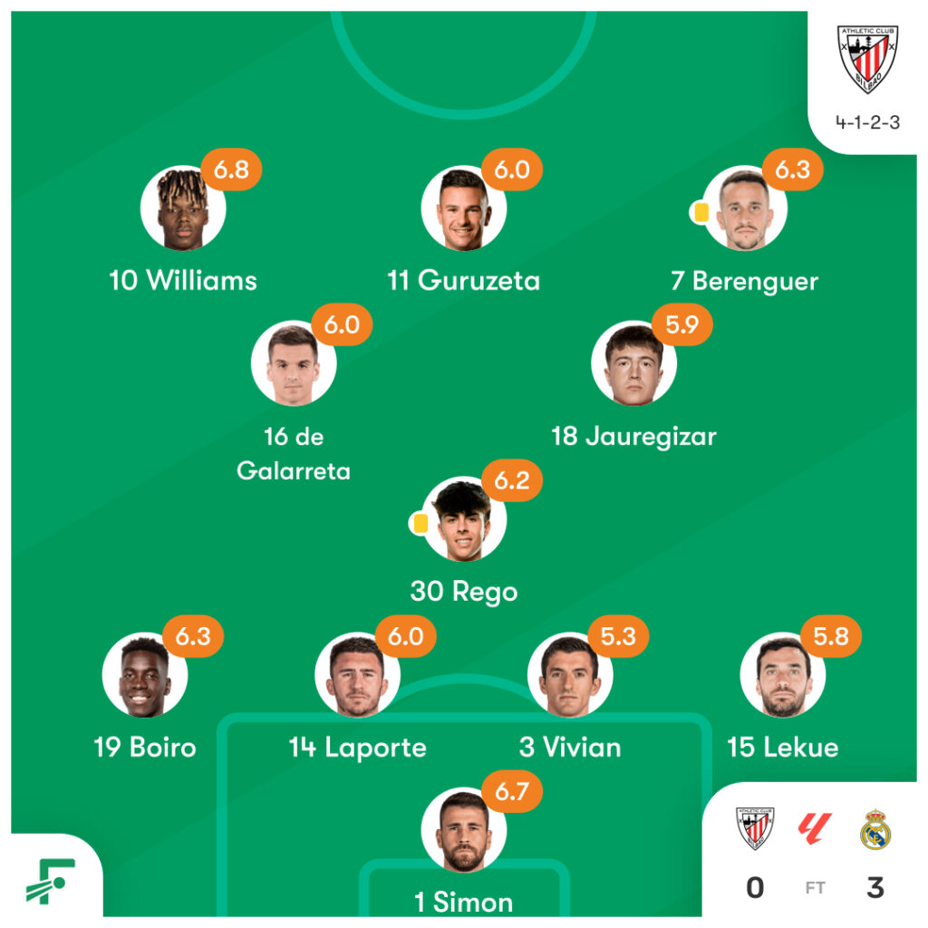 ラ・リーガ第19節アスレティック vs レアル・マドリードのスタメンとハイライト